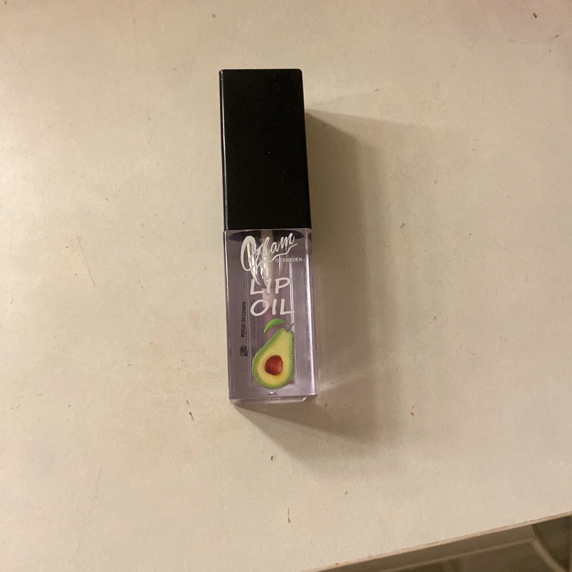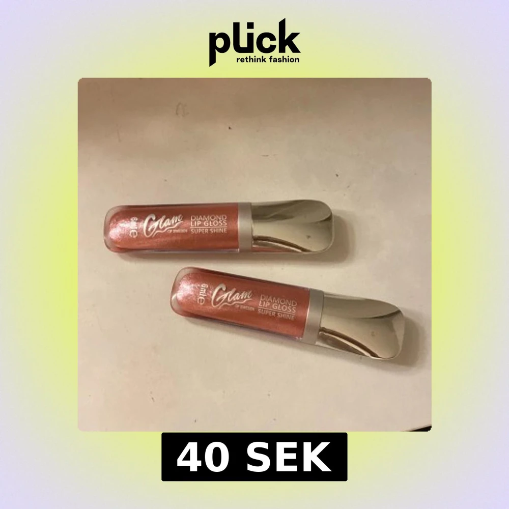Två Glam of Sweden Diamond Lip Gloss Super Shine i skimrande persikorosa med silvriga lock samt en Glam of Sweden Lip Oil med avokado, transparent formula i fyrkantig flaska med svart lock. Perfekt för glansiga och återfuktade läppar.