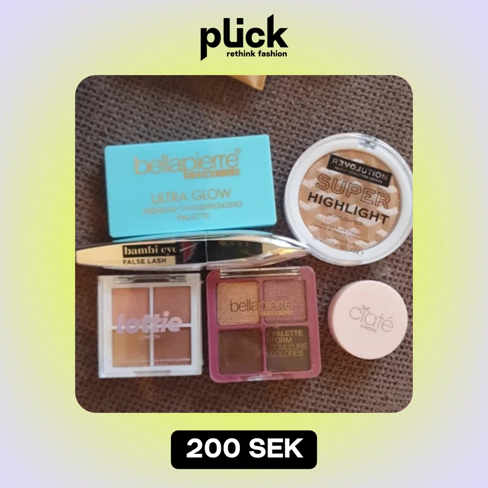 6 produkter säljes tillsammans för 200kr Alla sex är i nyskick/oöppnade 1highlighting&bronzing palette, 1highlighter, 1mascara(svart), 2 eyeshadow palettes, 1 bronzer.