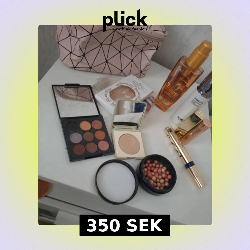 Säljer ett sminkpaket med KIKO Green Me highlighter i nyansen Champagne Gold, Estée Lauder Sumptuous Extreme mascara i guldig hylsa, ögonskuggspalett med varma och neutrala toner, rougepärlor i rosa och beige, samt två läppstift: ett rött i guldhylsa och ett nude i roséguld. Perfekt för dig som vill ha allt i ett. Sminkväska och lösnaglar.