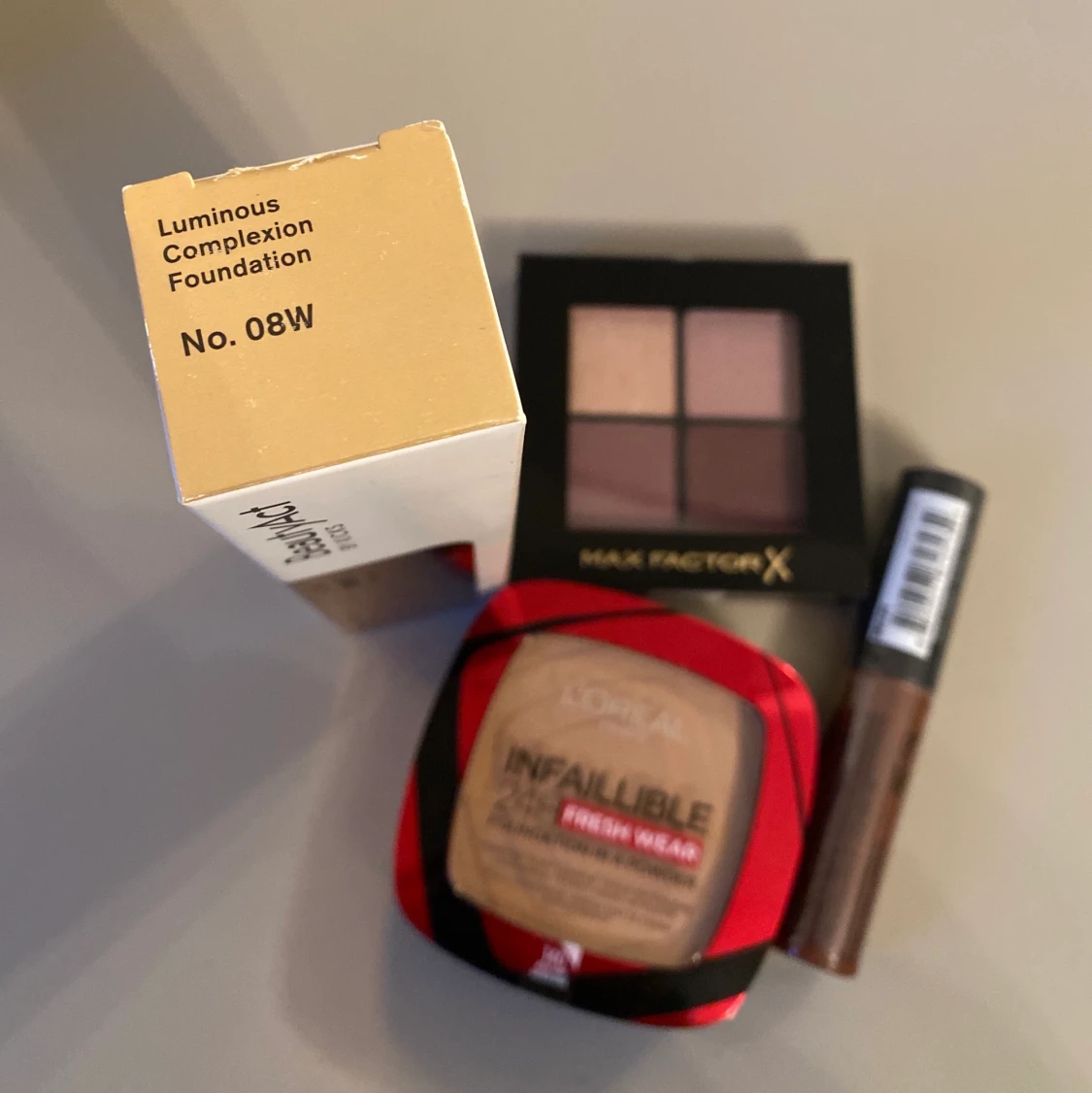 Fick dessa i julklapp och säljer pga fel färger. Går att köpa separat eller alla tillsammans. Pris för allting: 350kr. Pris separat: Nyx läppcream 50kr (ordinarie 99kr), Loreal puder 80kr (ordinarie 159kr), beautyact foundation 150kr (ordinarie 249kr), Max factor ögonskugga 90kr (ordinarie 169kr). Köparen betalar frakt, skickas via postnord ej spårbart 14kr (om man vill ha spårbart 51kr)