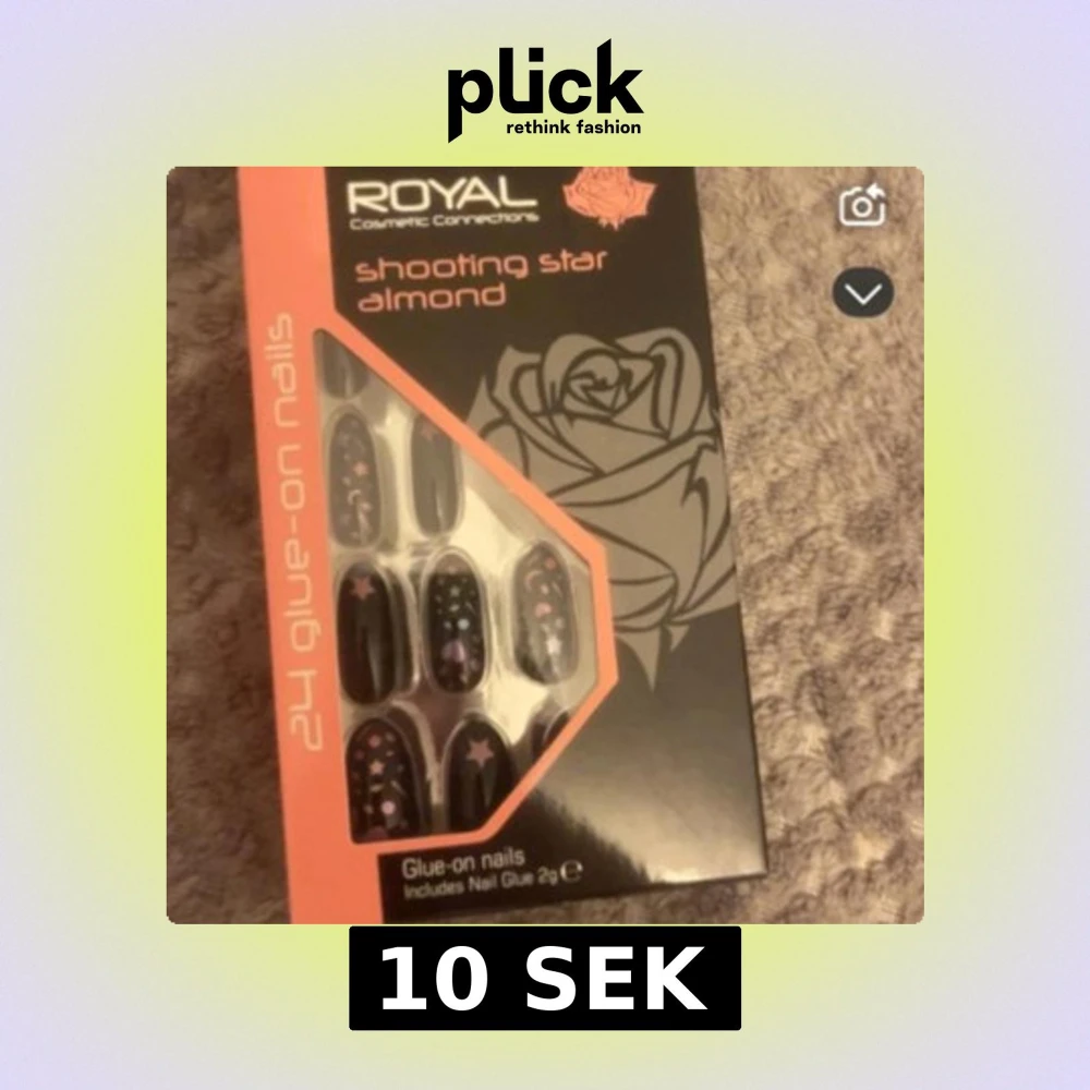 24 svarta glue-on lösnaglar i almond-form med stjärnor, månar och prickar i lila, rosa och blått. Paketet innehåller nagellim (2g). Perfekt för dig som vill ha en unik och färgglad nageldesign med cosmic vibes. Helt oanvända
