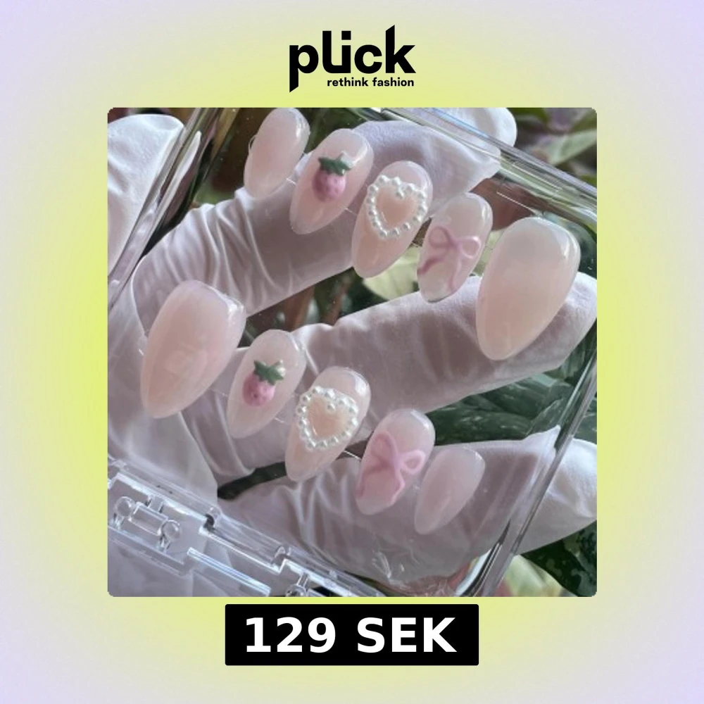 Set med långa, mandelformade press-on naglar i ljusrosa. Dekorerade med 3D-detaljer som små rosa jordgubbar, pärlformade hjärtan och ljusrosa rosetter. Kommer i genomskinlig ask. Perfekt för dig som gillar gulliga och kreativa naglar.