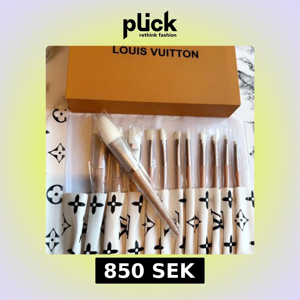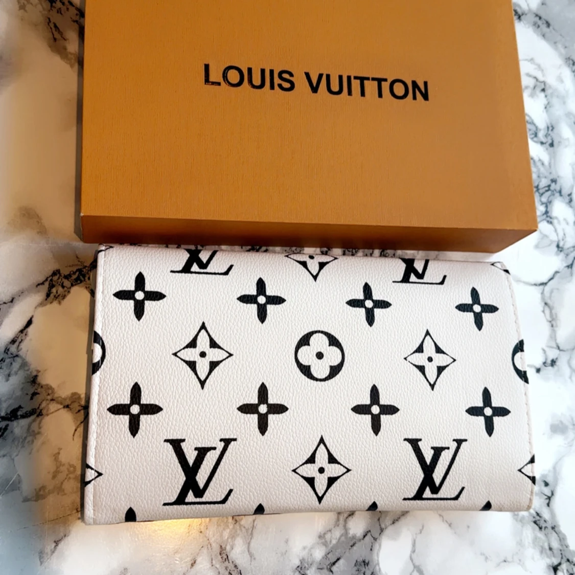 Snygg vit kuvertväska med klassiskt svart monogramtryck. Väskan är i slät skinnimitation och har plats för sminkborstar eller andra småsaker. Perfekt accessoar för dig som gillar lyxig och trendig design.