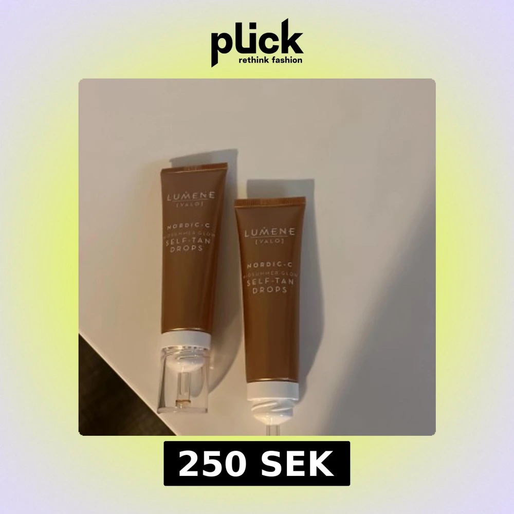 Två tuber Lumene Nordic-C Midsummer Glow Self-Tan Drops, 30 ml vardera. Ger en solkysst look med hjälp av brun-utan-sol-droppar. Tuben är brun med vit text och har en praktisk pump. Perfekt för att blanda i din dagkräm för gradvis färg.