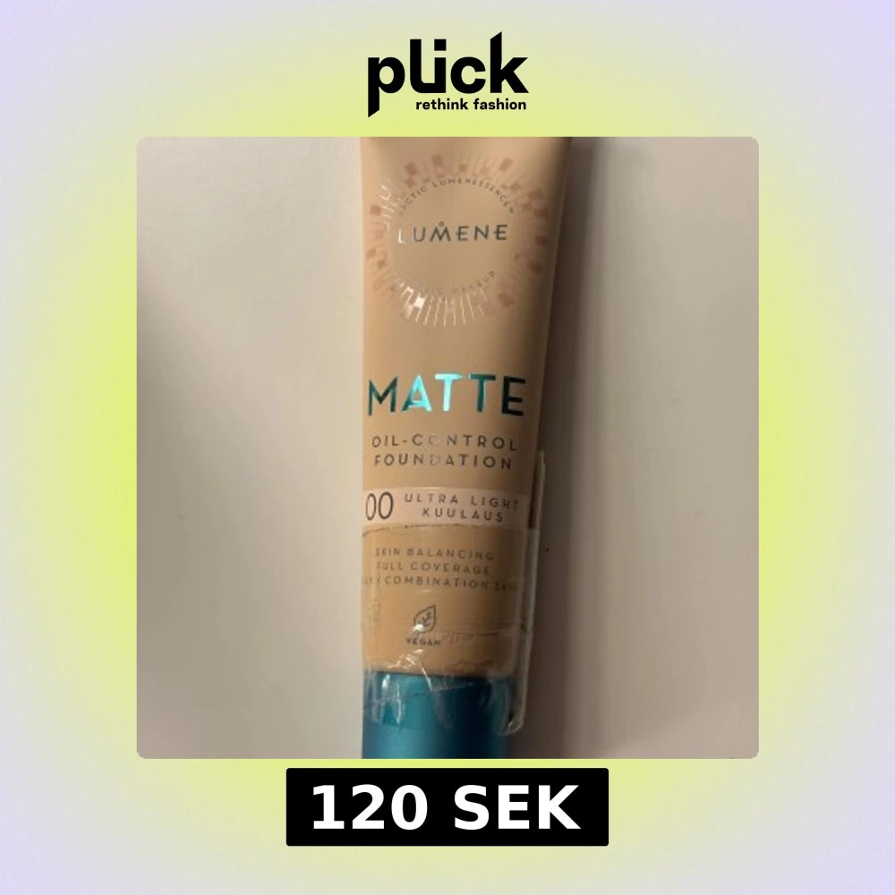 Lumene Matte Oil-Control Foundation i nyansen 00 Ultra Light Kuulaus. Den är vegansk och erbjuder full täckning samtidigt som den balanserar huden. OÖPPNAD