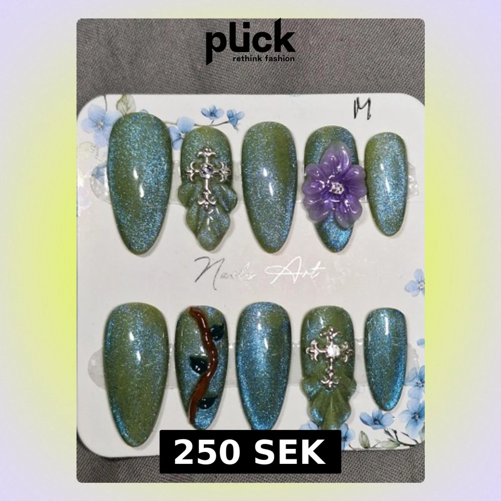 Handgjorda nagel set bra kvalitet och fina. Man får med rengöring beskrivning o de man behöver för att applicera naglarna❤️ storlek M