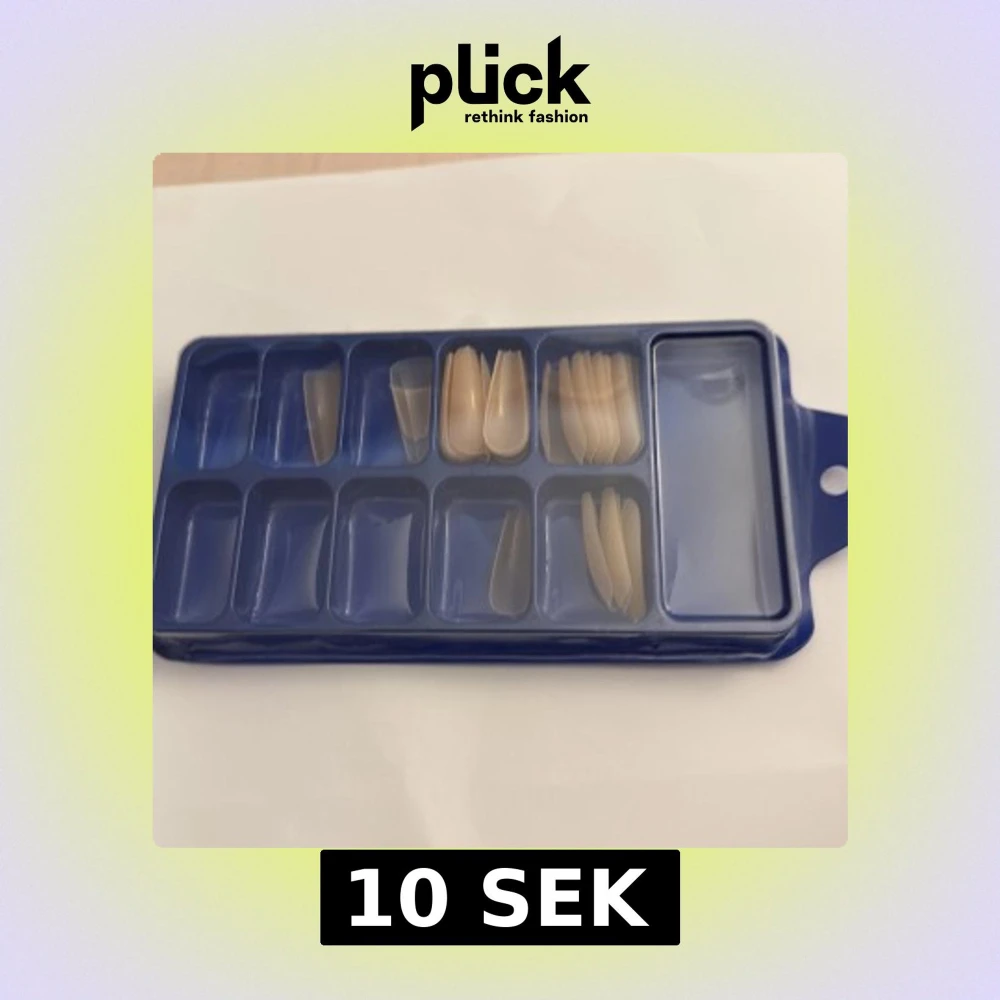 Säljer ett set med transparenta och ljusbeige falska nageltippar i olika storlekar, för dig som vill fixa snygga naglar hemma. Nageltipparna kommer i en blå plastförpackning med flera fack för enkel sortering.