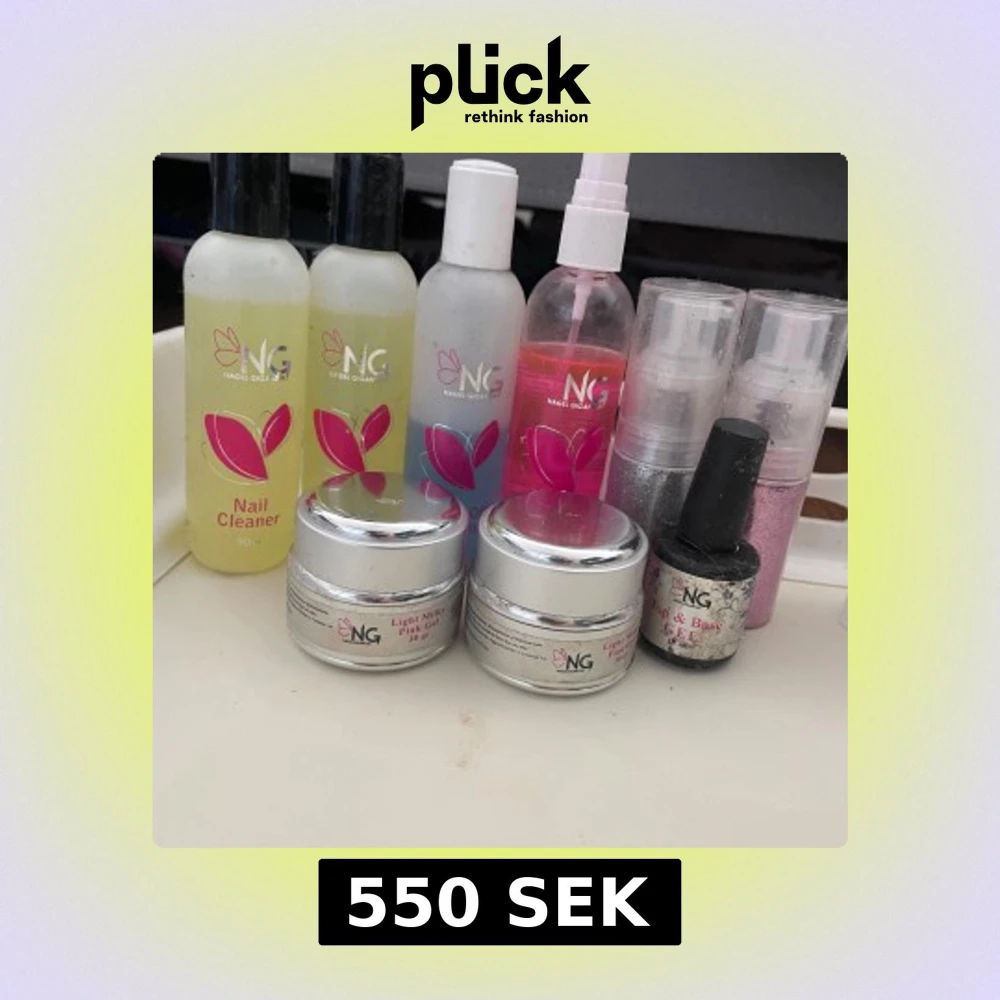 Säljer ett nagelkit från NG med flera produkter: nagelrengöring, geléer i rosa och ljusrosa, glitter, och pensel. Perfekt för att skapa snygga naglar hemma. Flera burkar och flaskor i olika storlekar, samt glitter i silver och rosa. pris kan diskuteras