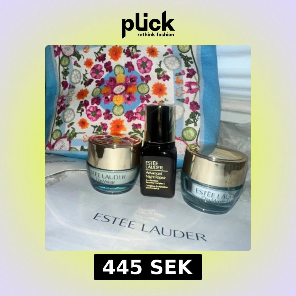 Snyggt set från Estée Lauder med två DayWear-krämer i ljusblå glasburkar med guldlock och en Advanced Night Repair-serum i mörkbrun flaska med gulddetaljer. Kommer med en blå necessär med färgglatt blommönster. Perfekt för dig som älskar hudvård och vill ha lyxiga produkter. Detta set innehåller Estée Lauder DayWear och Advanced Night Repair. Perfekt för din dagliga hudvårdsrutin. En söt necessär medföljer. 🎁