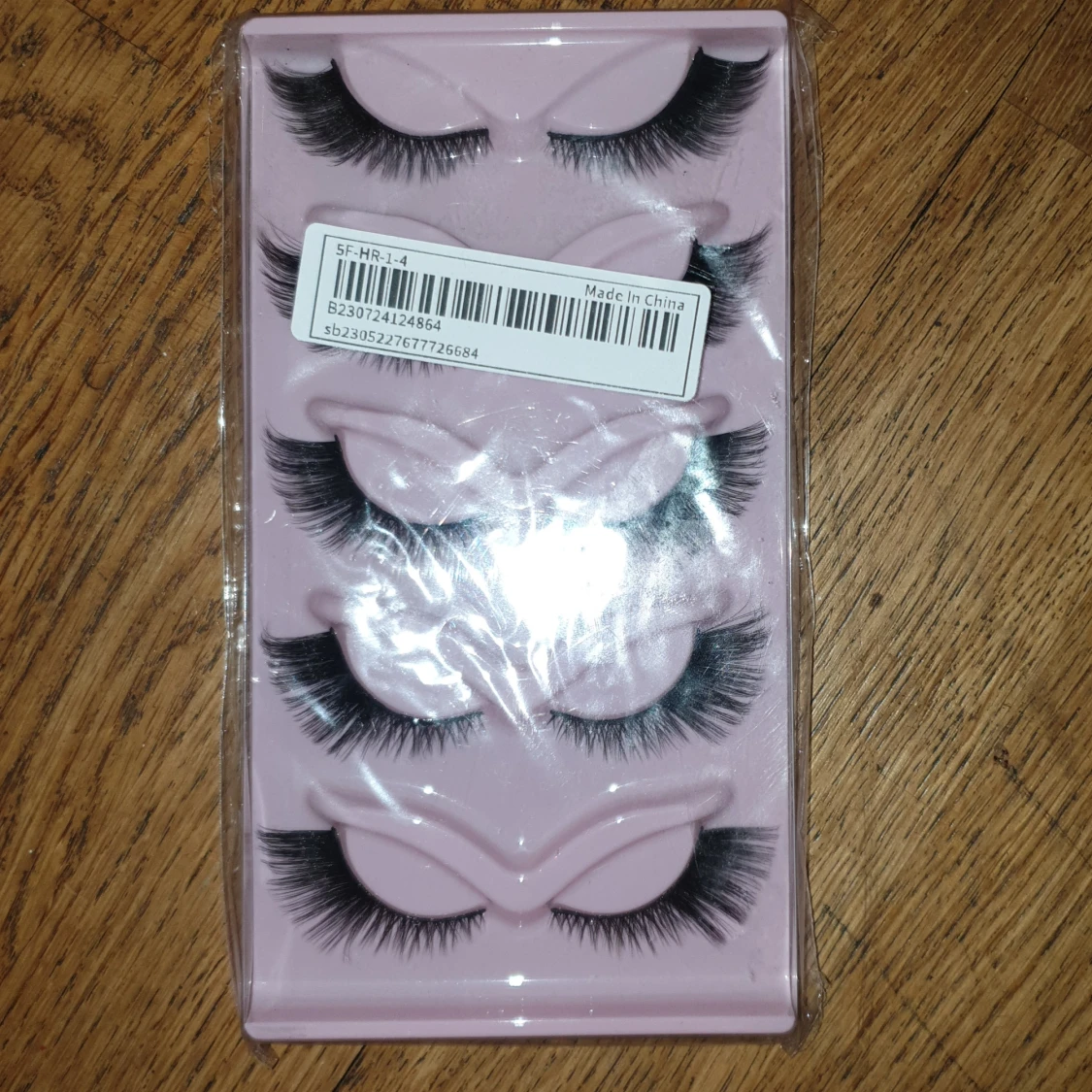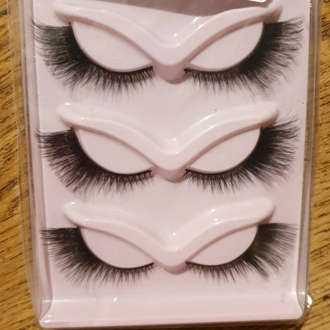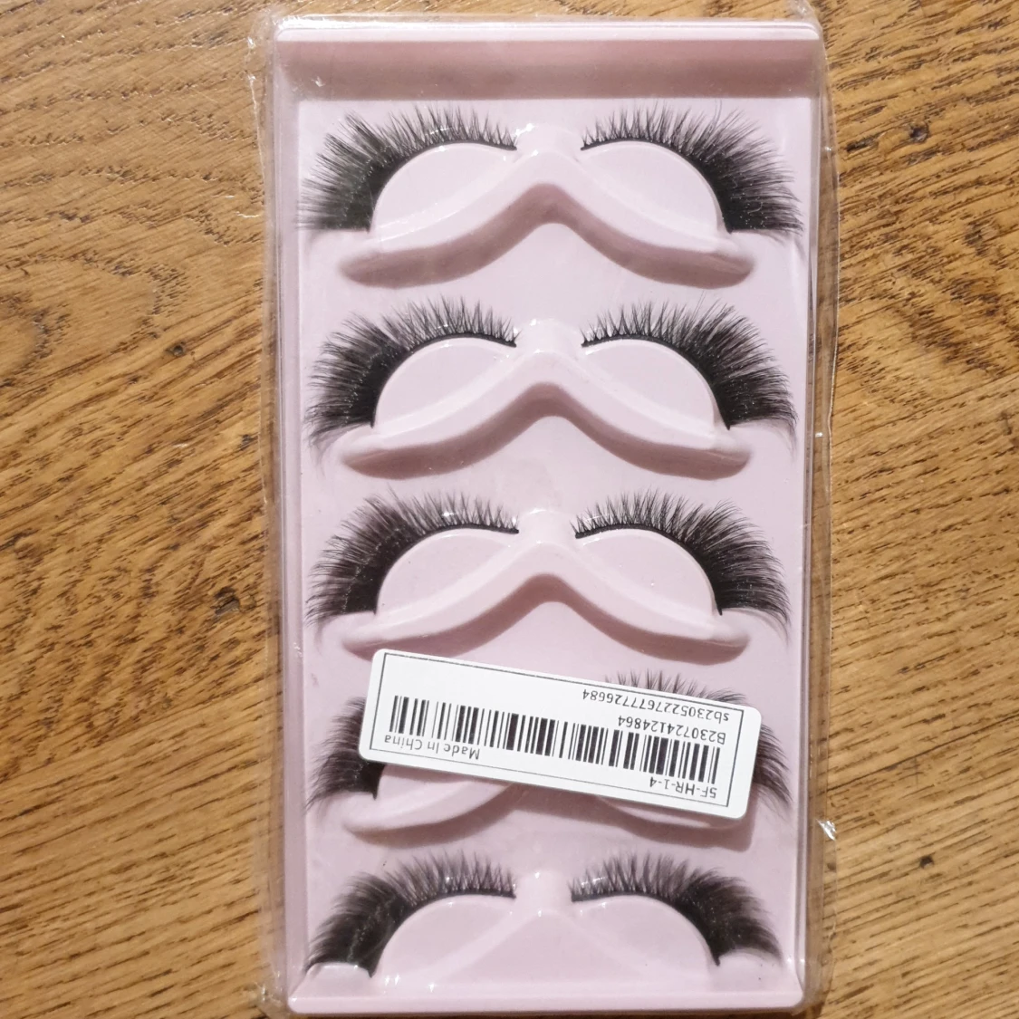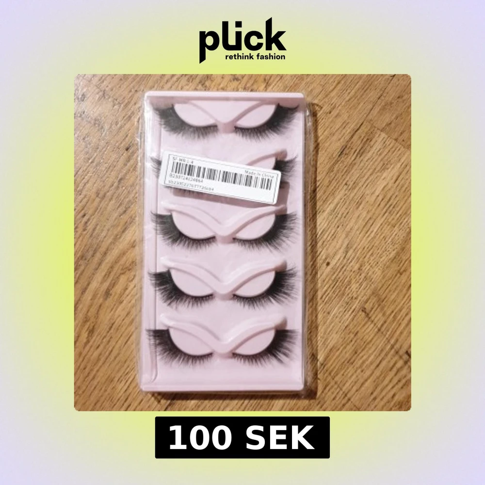 Set med fyra par svarta lösögonfransar. Fransarna är täta och dramatiska, perfekta för en intensiv look. De kommer i en rosa förpackning som håller dem säkra och organiserade.
