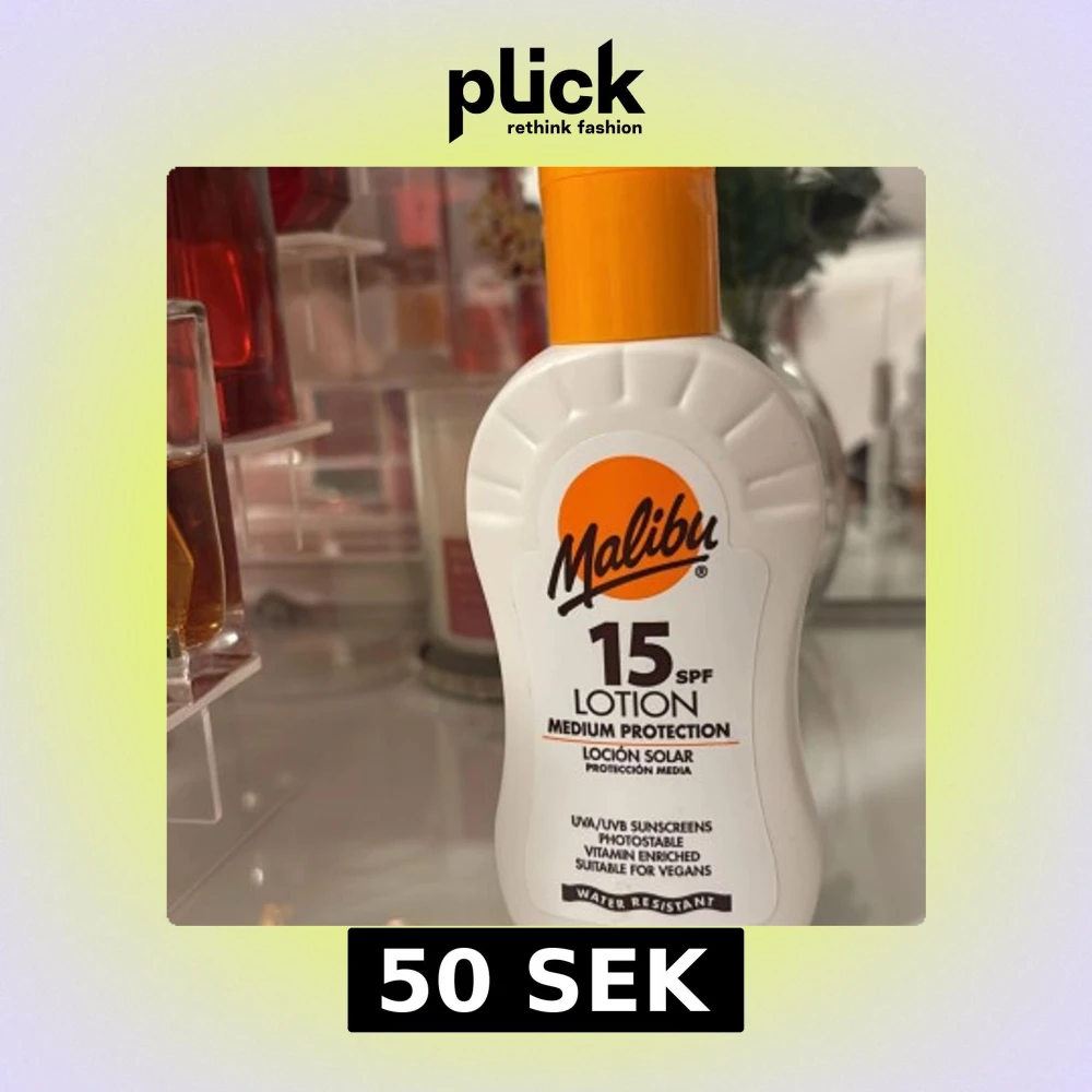 Solkräm från Malibu med SPF 15 och medium skydd. Kommer i en vit plastflaska med orange lock och logga. Lotionen är vattenresistent, berikad med vitaminer och passar veganer. Perfekt för dig som vill ha ett lätt solskydd.