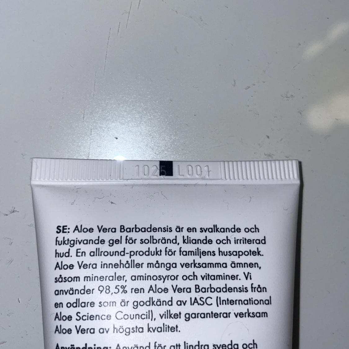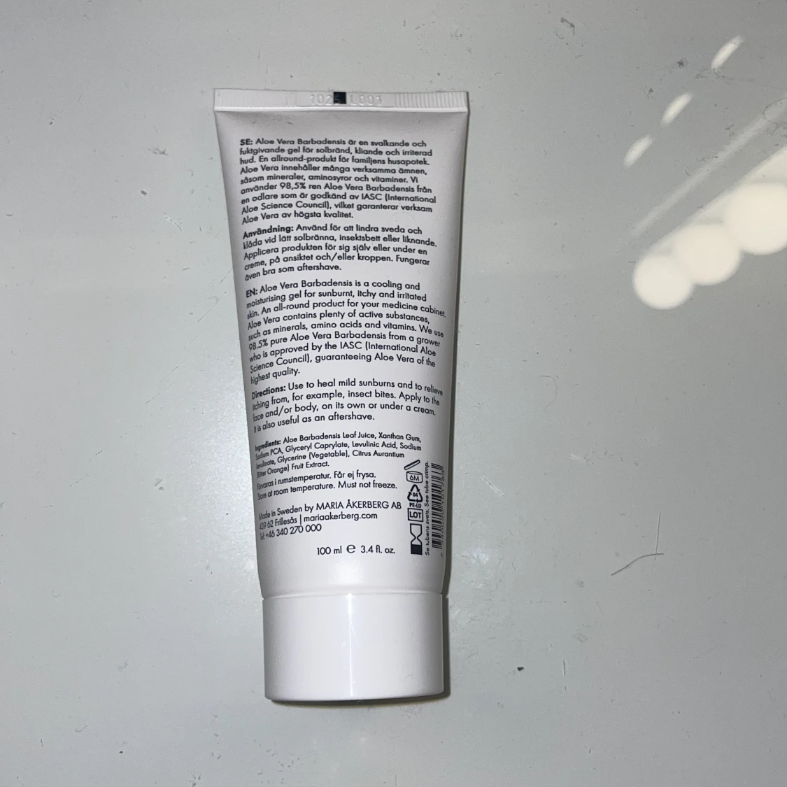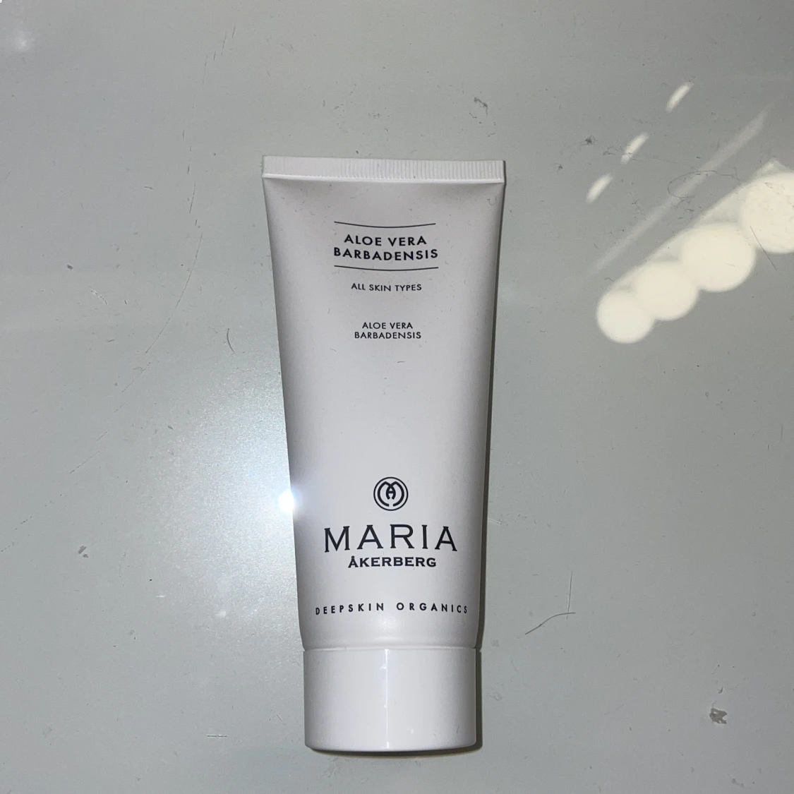 Aloe Vera Barbadensis gel från Maria Åkerberg i vit tub, 100 ml. Innehåller 98,5% ren aloe vera och är perfekt för att lugna och återfukta huden. Produkten går ut 10/25 så säljer billigt💕