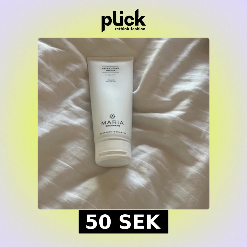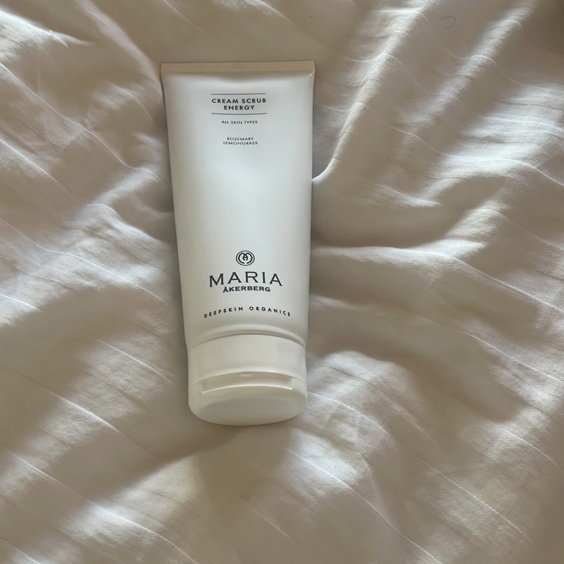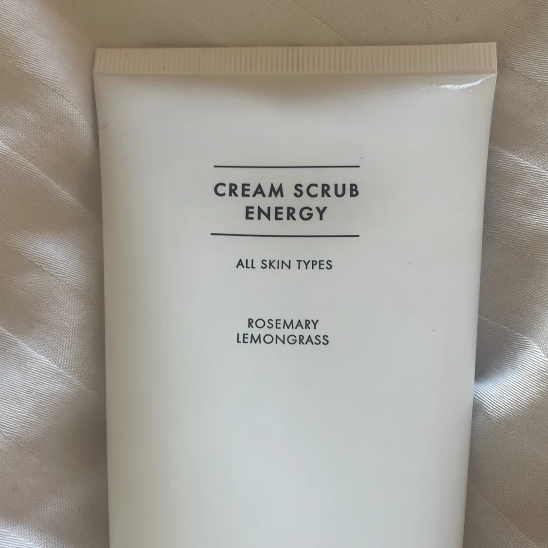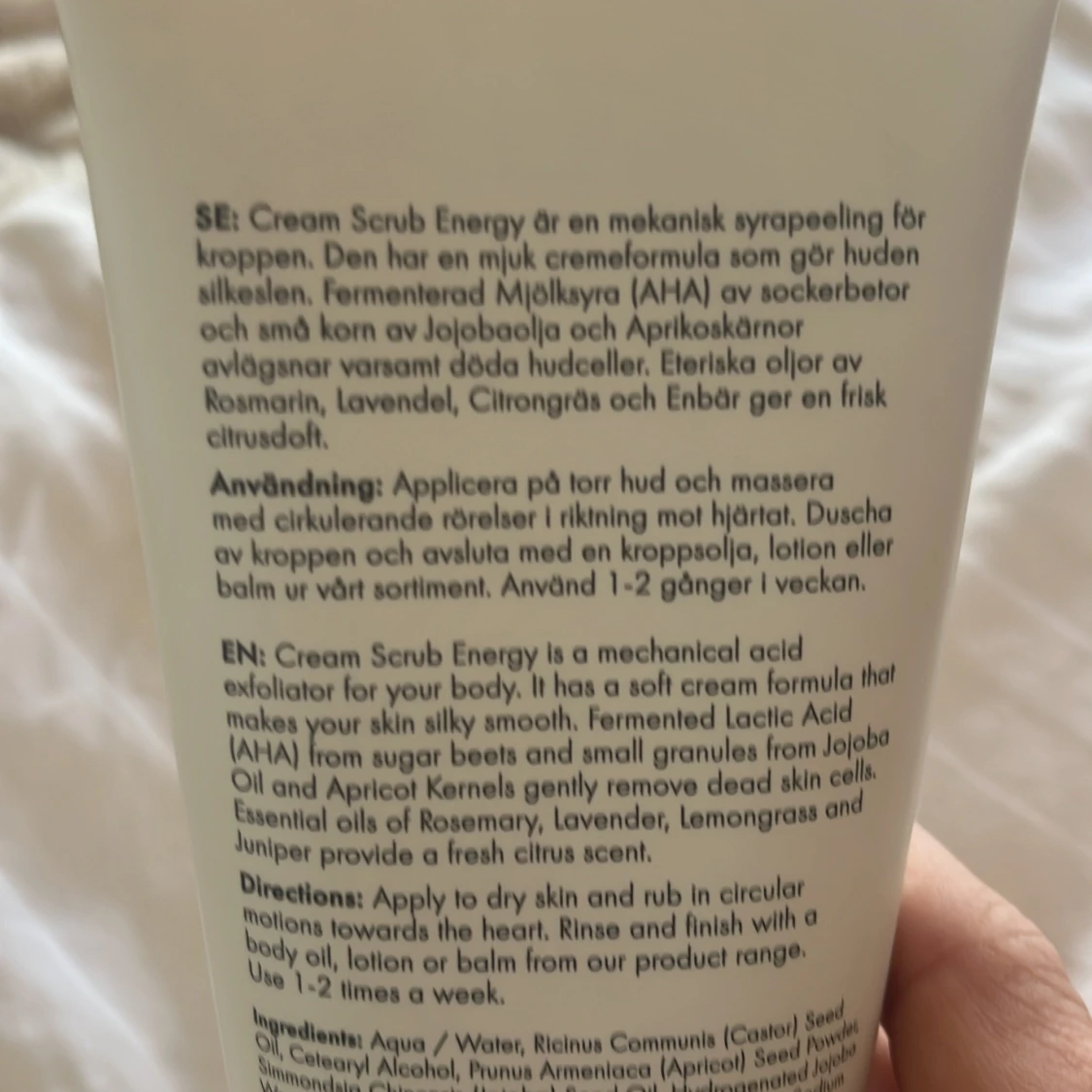Cream Scrub Energy från Maria Åkerberg är en vit tub med mjuk cremeformula som innehåller eteriska oljor av rosmarin, lavendel och citrongräs. Den har små korn av jojobaolja och aprikoskärnor som exfolierar huden och ger en fräsch citrusdoft.