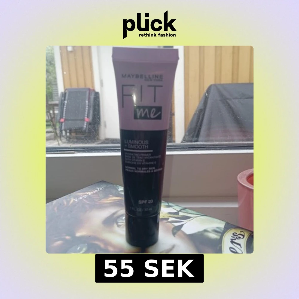 Maybelline Fit Me Luminous + Smooth Foundation i tub, 30 ml. Ger en återfuktande finish med vitamin E och SPF 20. Passar normal till torr hud. Tuben är svart och lila med skruvkork och smal applikator.