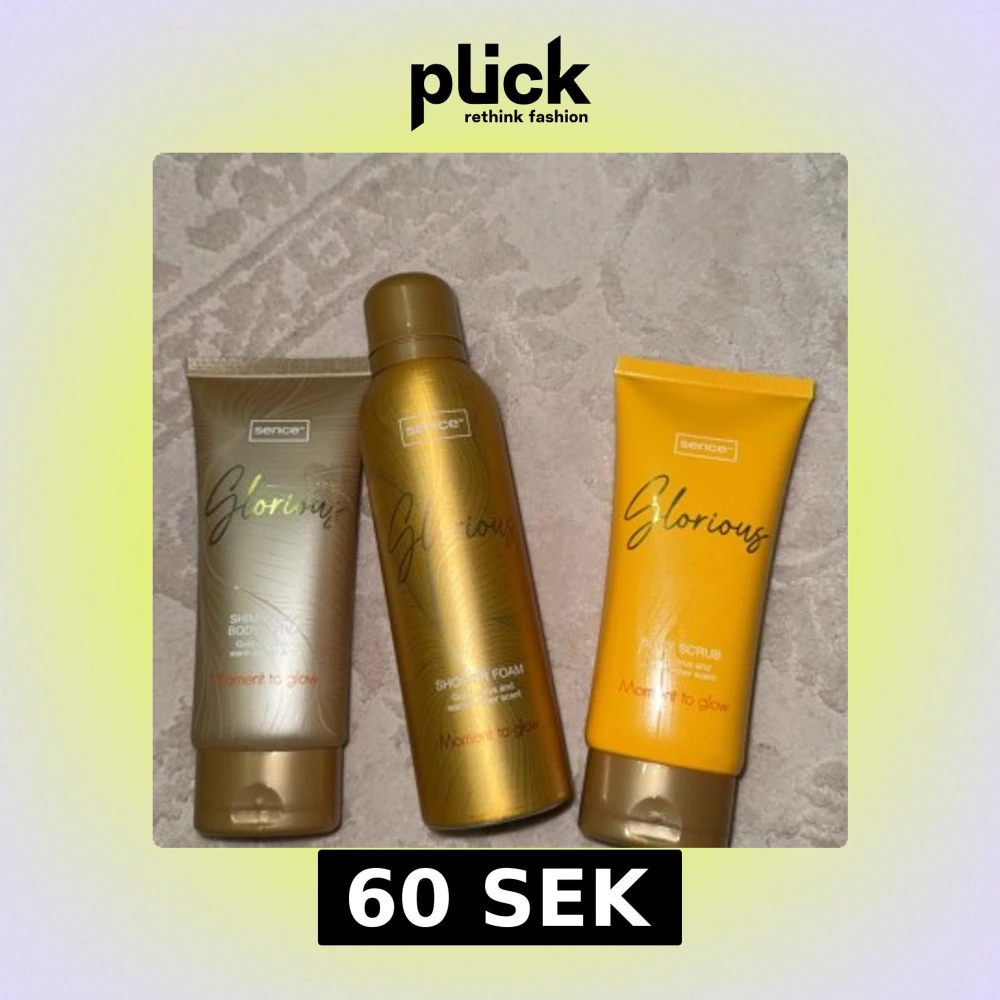 Säljer ett set från Sence Glorious med tre produkter: en skimrande body lotion i guldbeige tub, en duschfoam i metallicguld flaska och en body scrub i gul tub. Alla har doft av gold citrus och varm amber. Perfekt för dig som vill ha extra glow och fräsch känsla.