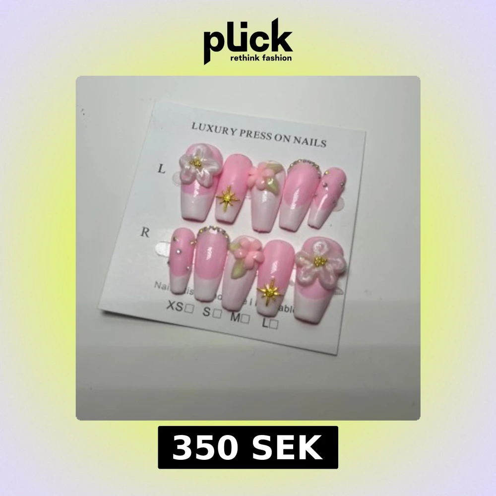 Säljer ett set med lyxiga press-on naglar i ljusrosa och vitt med 3D-blommor, pärlor och guldstjärnor. Naglarna har en elegant, lång form och dekoreras med detaljer i guld och pastell. Perfekt för dig som vill ha en söt och unik nageldesign. Obs handgjorda utav mig själv därav pris