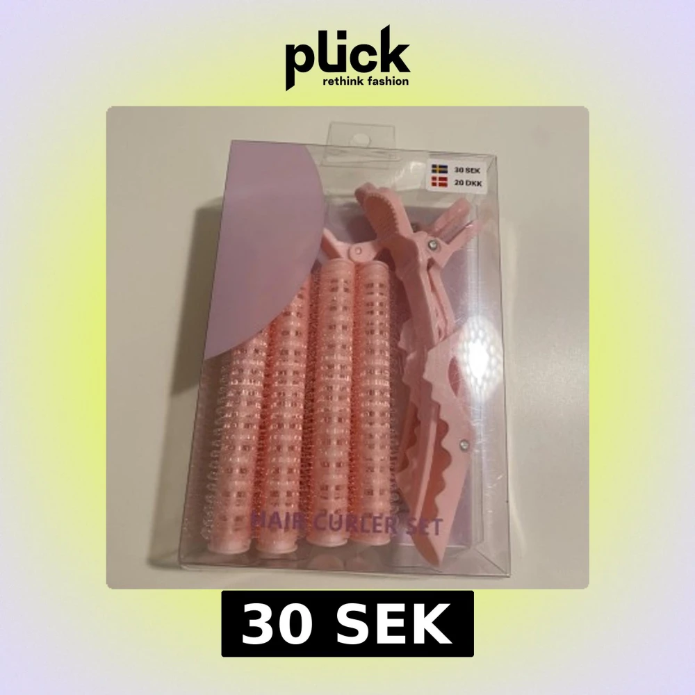 Snyggt rosa hårrollerset med fyra rullar och två klämmor, perfekt för att skapa volym och lockar. Produkten är oanvänd och levereras i originalförpackning. Passar alla hårtyper men inte för tjock hår. Den är enkel att använda hemma.