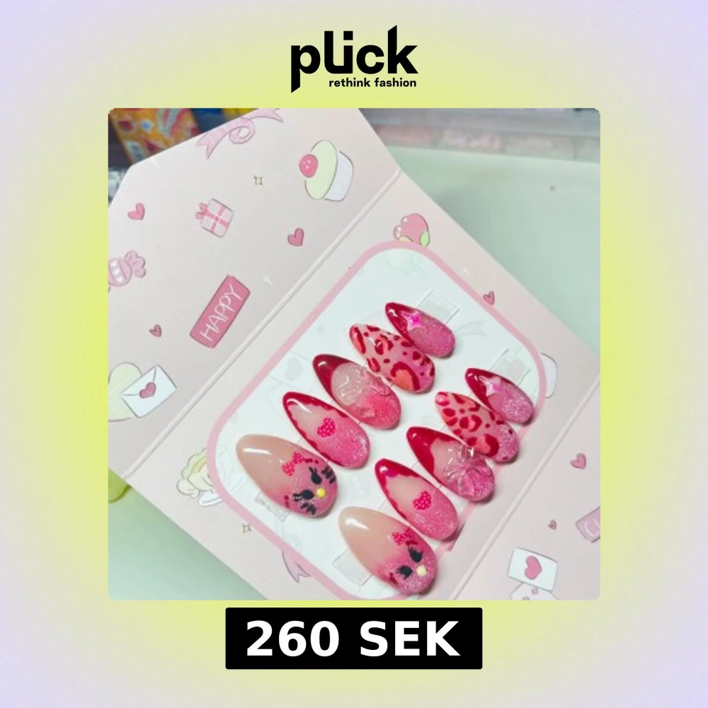 Säljer ett set med 10 st press-on naglar i mandelform med olika rosa och röda designer. Naglarna har glitter, hjärtan, rosetter, leopardmönster och söta kattmotiv. Perfekt för dig som älskar kawaii och vill ha unika naglar med mycket detaljer.