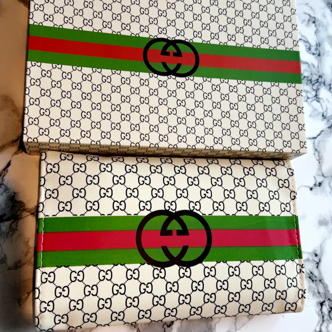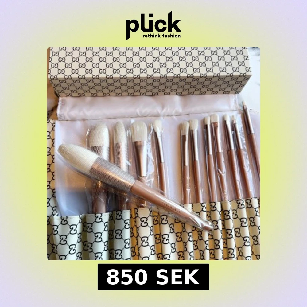 Exklusivt set med sminkborstar i beige och guld med vita borst. Setet innehåller flera olika borstar för ansikte och ögon, perfekt för att skapa en flawless look. Kommer i en snygg GG-mönstrad förpackning med grönt och rött band.