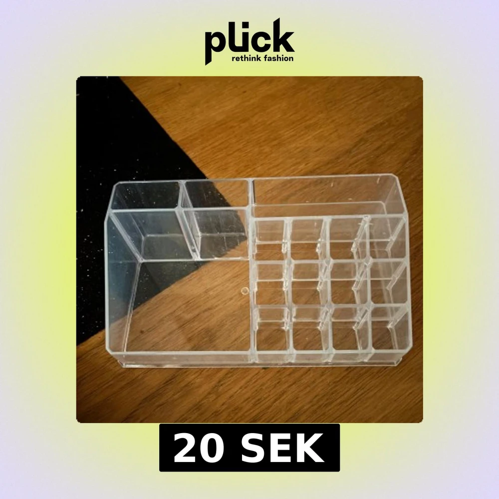 Praktisk transparent sminkorganiserare med flera fack för enkel förvaring av sminkprodukter. Perfekt för att hålla ordning på läppstift, borstar och andra små tillbehör. Tillverkad i hållbar plast. 8cm x 12cm x 22 cm, nypris 150