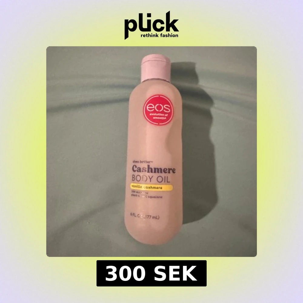 Cashmere Body Oil från EOS med doft av vanilla cashmere. Kommer i en ljusbeige plastflaska med rosa lock och röd logga. Innehåller 177 ml och är berikad med sheasmör och växtbaserad squalane för mjuk och återfuktad hud.