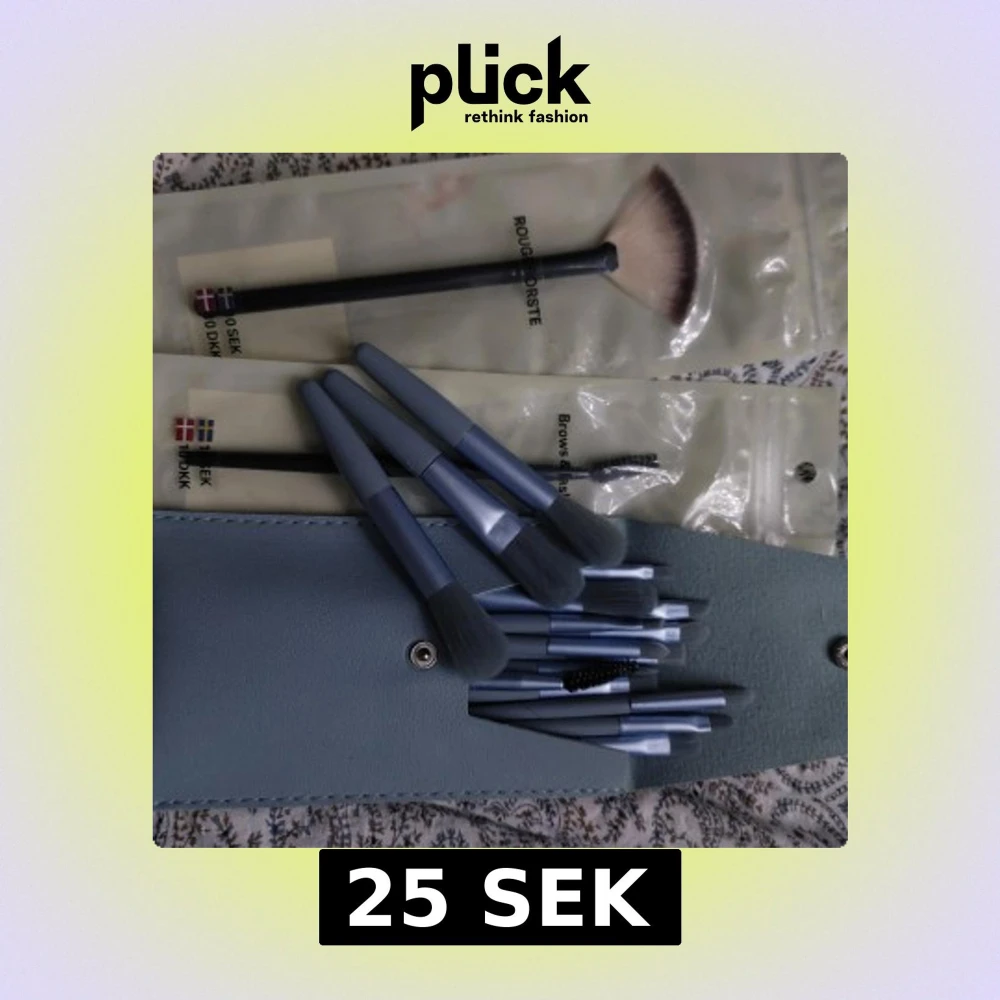 Ett set med flera sminkborstar i olika storlekar och former, inklusive en rougeborste och en ögonbrynsborste. Borstarna har blå handtag och kommer i ett snyggt blått fodral med knappstängning.