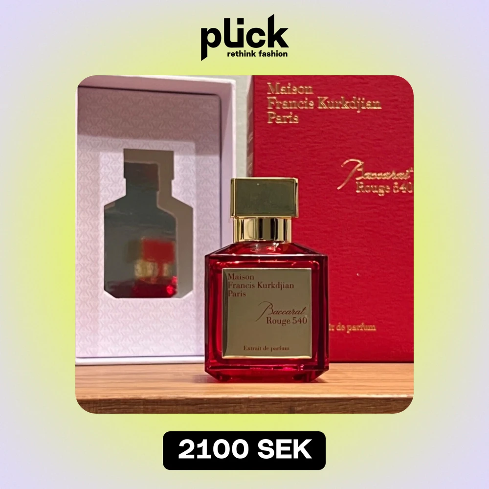 Säljer en lyxig parfymflaska av Maison Francis Kurkdjian, Baccarat Rouge 540 Extrait de Parfum. Flaskan är i en elegant röd färg med en guldig etikett och kork. Perfekt för den som vill ha en exklusiv doftupplevelse. Flaskan är 70 ml och kommer i en snygg röd förpackning.