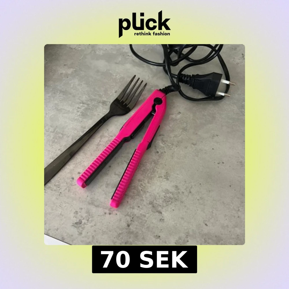 En liten och smidig plattång i starkt rosa färg med svarta detaljer. Perfekt storlek för att ta med i väskan. Plattången har en enkel av/på-knapp och sladd med EU-kontakt. Plattången blir snabbt varm.