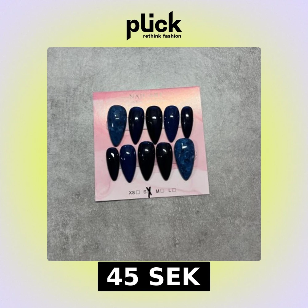 Säljer ett set med 10 lösnaglar i storlek S. Naglarna har en snygg mörkblå färg, vissa med marmorerad effekt och andra med glansig finish. Perfekt för dig som vill ha en cool och unik look. Handgjorda