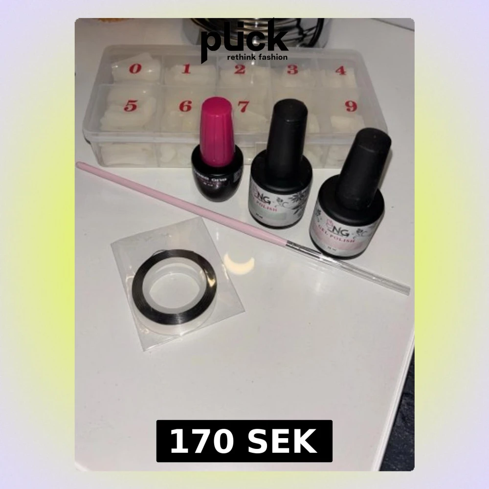 Nagelkit med två NG gelpolish i färgerna Peach (ljusrosa) och Turquoise (turkos), samt en Base One primer, en tunn rosa pensel, dekorationsband och en låda med lösnaglar. Allt nästan som nytt. Ordinariepris för gelpolish: 125kr/styck