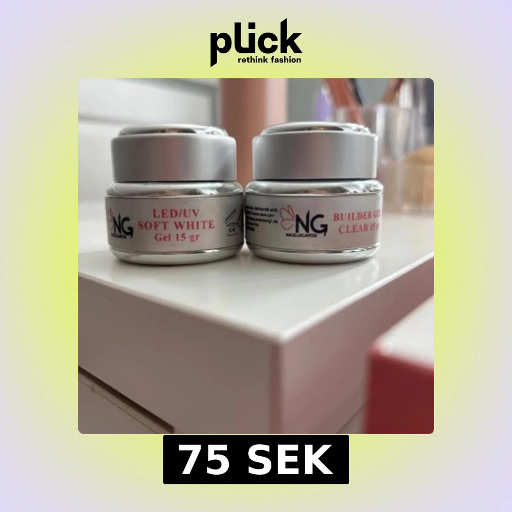 Två burkar gele för naglar (15g). En är vit och den andra transparant. De är nästan imprensip oanvända utan endast testad fåtals gånger. Säljs endast tillsammans. Läs om gele på bild 3 och 4. Obs nagelgele kan ge livslånga allergier och vill inte uppmana någon utan utbildning och kunskap att göra detta hemma själv!!!!‼️⚠️