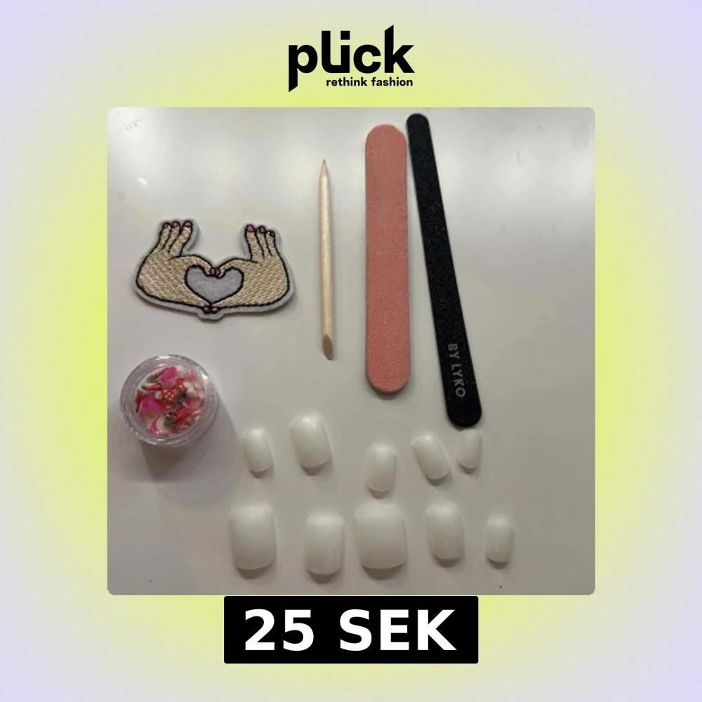 Komplett nagelkit med vita lösnaglar, två nagelfilar, en träpinne för nagelband och en burk med nageldekorationer. Inkluderar även en söt tygpatch med händer som formar ett hjärta. Perfekt för att skapa en unik nagelstil hemma.