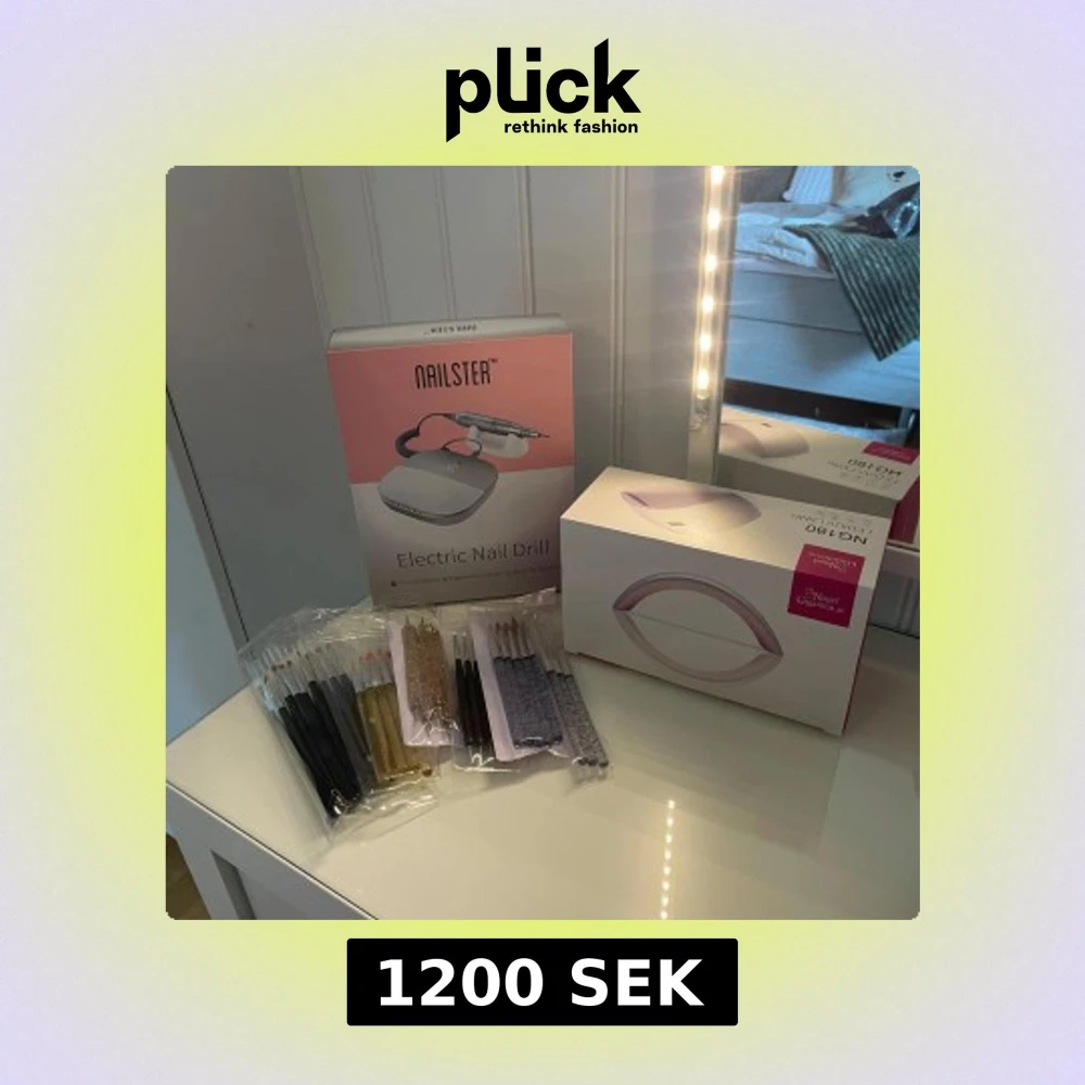 Säljer mina nagelgrejer då jag tappat intresset. Säljer helst allt i ett kit för 1200 kr men det går att köpa en separat också 😇Elektrisk nagelfil från nailster, nypris 1299 kr (separat 800 kr). UV-lampa från nagelgiganten, nypris 499 kr (separat 200 kr). Penslar & verktyg, oanvända (separat 200 kr). Tipparna, kudden och glittret på andra bilden ingår vid köp av en produkt (om man vill). *Bilden från nailsters hemsida är en nyare variant än den jag säljer, men priset var detsamma när jag köpte!