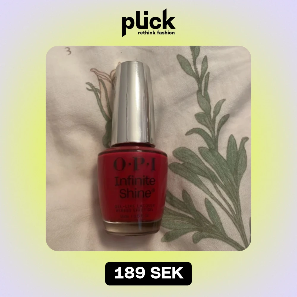 Säljer ett superfint rött nagellack från OPI Infinite Shine. Det är en gel-liknande lack som ger en glansig finish och lång hållbarhet. Perfekt för både vardag och fest! Flaskan innehåller 15 ml. älskar den röda färgen, och den torkar väldigt snabbt , typ ungefär 30 sek tror jag. Den är helt ny och jag har endast använt den på en nagel 1 gång ( ren nagel ). färgen är super fin och glansig. köpte för 200 kr men säljer för 189 kr