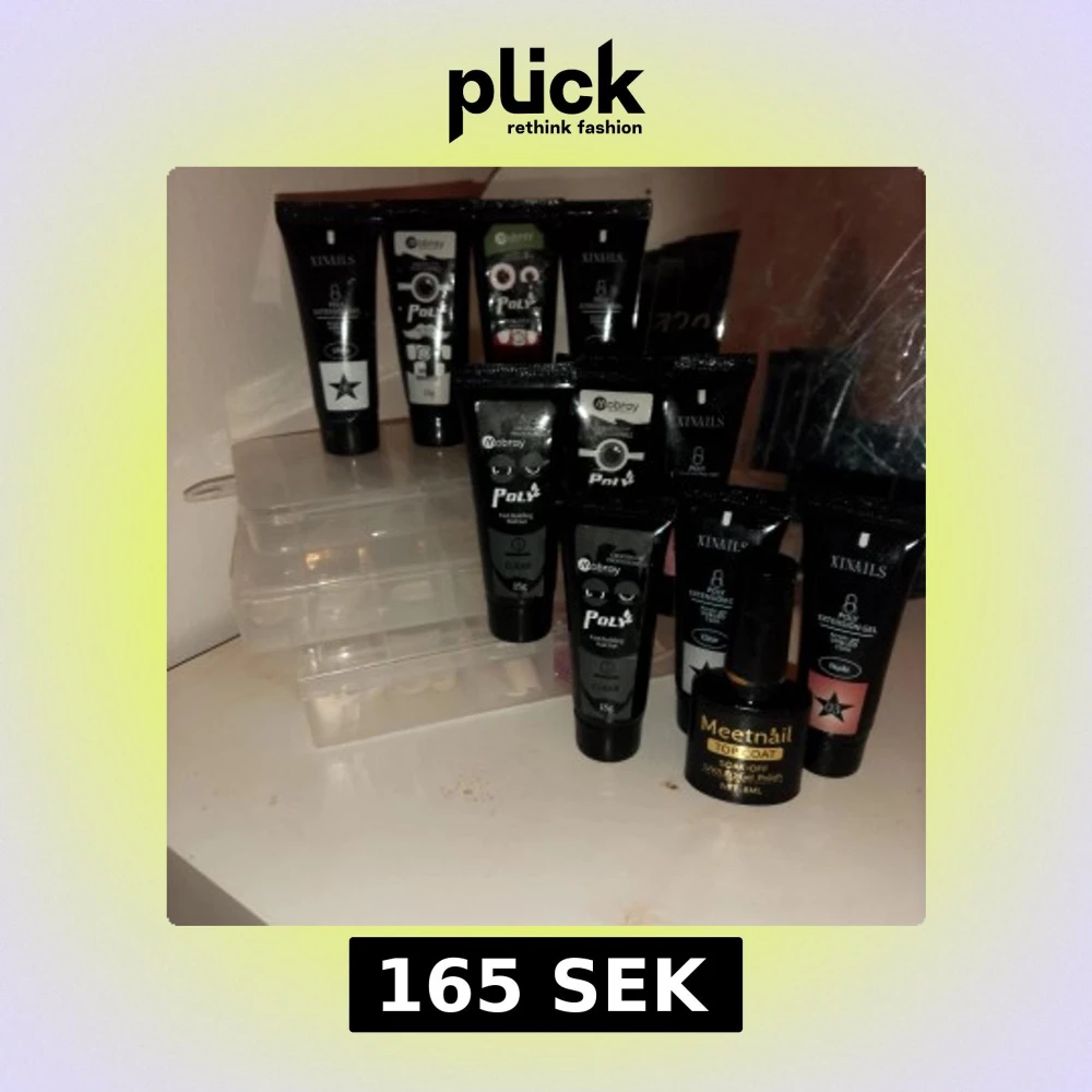 Ett set med flera nagelprodukter inklusive poly gel från Mobray i olika färger och en top coat från Meetnail, och tre lådor med lös naglar och tippar .Perfekt för att skapa egna nageldesigner hemma. skriv för mer bilder på naglarna osv:)