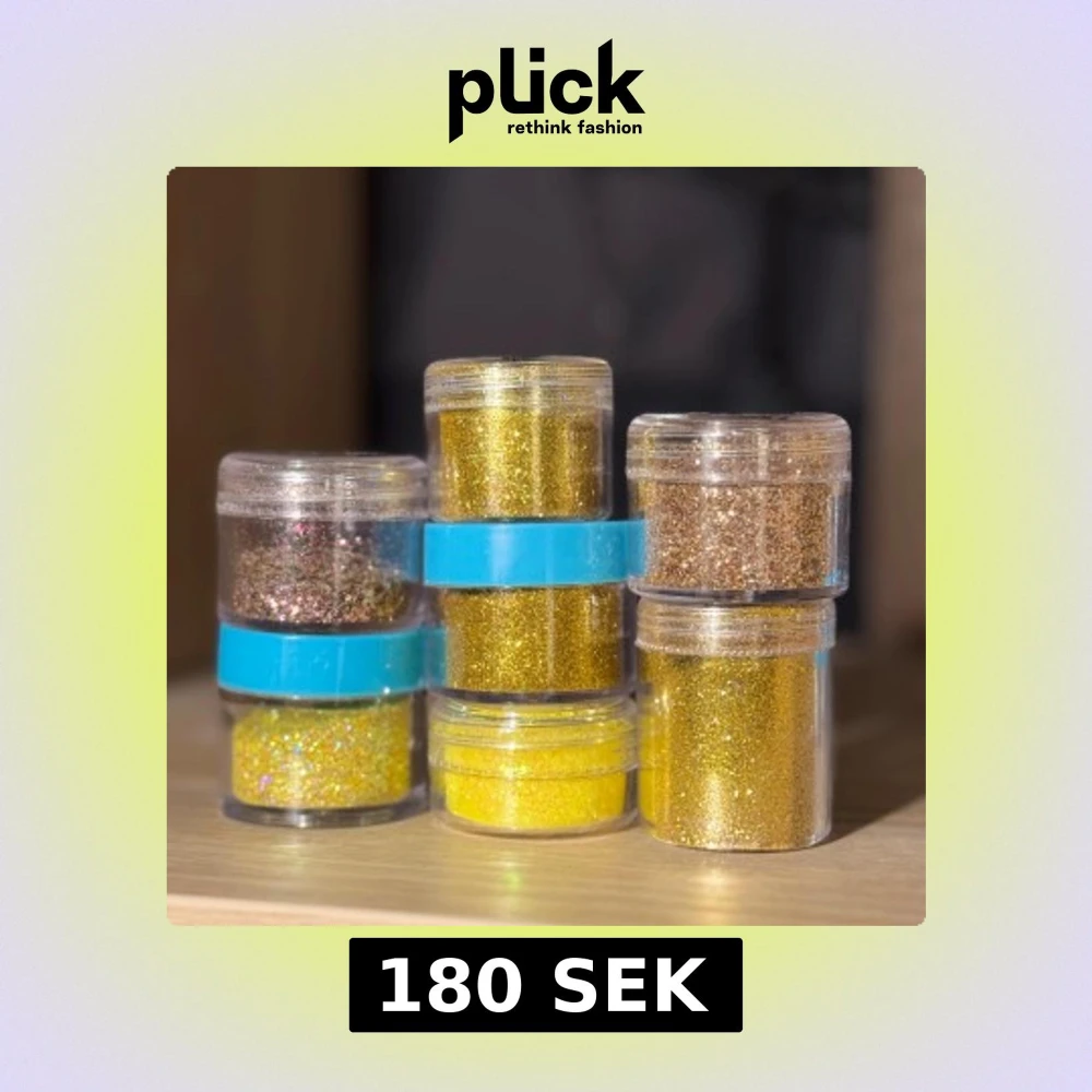7 burkar med löst glitter i nyanser av guld. Kommer i små genomskinliga plastburkar. Burken till vänster är halvfullt! Burkarna kan ha repor pga att ha legat bland andra produkter och märkta med något nummer, men det är inga problem med produkterna.