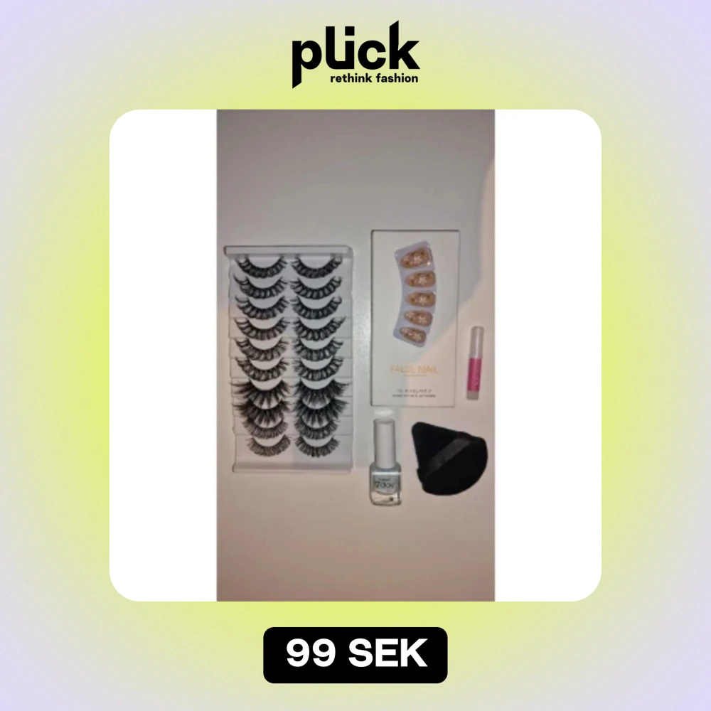 Fransar (oanvända, i bra skick), Press On Naglar (nya, oöppnade), Nagellack (ljusblå, öppnad men använts endast en gång, Depend), Smink grejen (tror den är till för att sätta puder, Ny) OBS! (nagellimmet på första bilden ingår också)