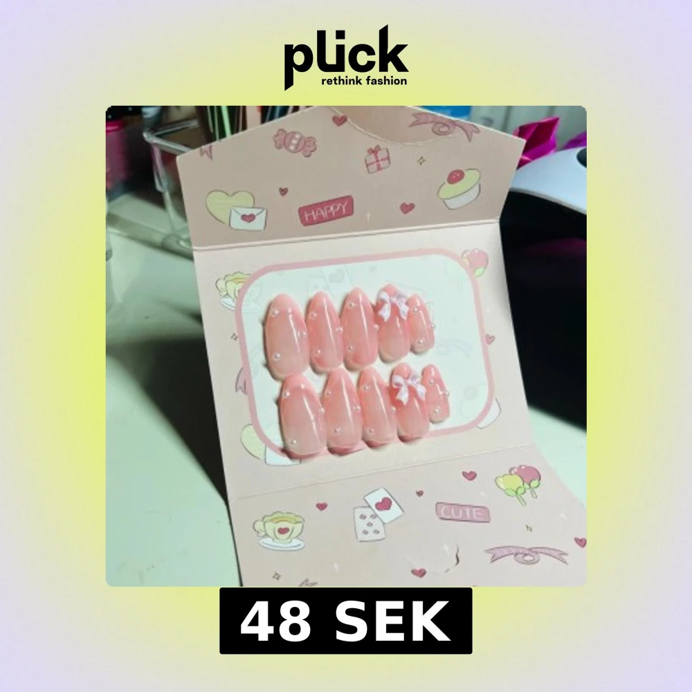 Ett set med 10 lösnaglar i en mjuk rosa färg, dekorerade med små pärlor och två vita rosetter. Naglarna har en elegant, mandelformad design och kommer med tillbehör som lim, nagelfil, träpinne och alkoholpad för enkel applicering. Perfekt för dig som vill ha gulliga och trendiga naglar.