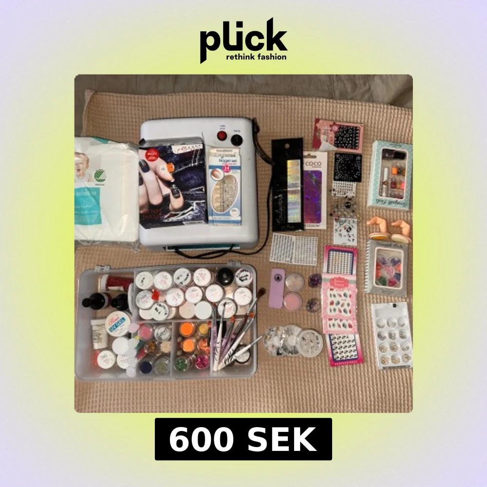Allt du behöver för att göra gelenaglar hemma! färgade glitter, UV-gel, penslar, nageldekorationer, stickers, lösnaglar och verktyg. Innehåller även nagelstenar, paletter och olika nagelstickers i färgglada och metallic nyanser Kommer tyvärr inte kunna ta fler bilder då det tar upp alldeles för lång tid men finns i princip alla färger ni kan tänka er. Glitter, Chrome, smycken, uv-lampa mm.. Det är i befintligt skick: vissa grejer är oöppnade medans vissa är halvfulla. Nypris är ca 2000kr