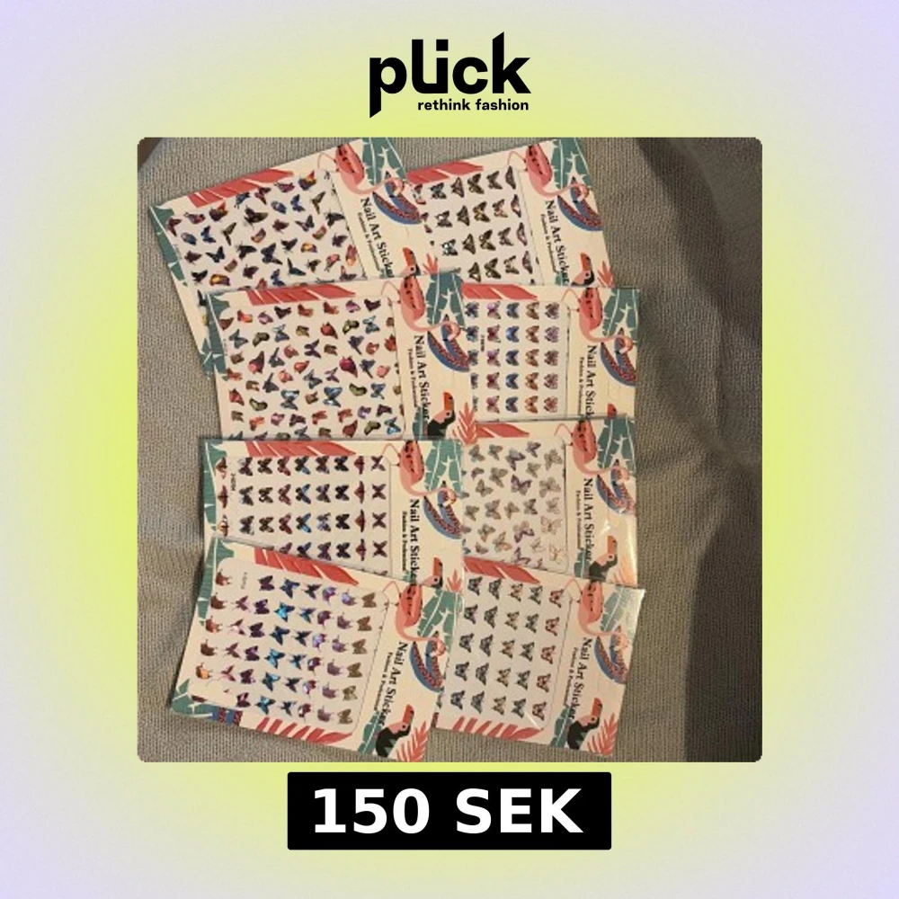 Säljer 8 ark med nagelstickers i form av fjärilar i olika färger och mönster. Perfekt för att skapa unika och kreativa nageldesigner. Stickersarna har metallic och holografiska effekter och kommer i både små och större storlekar. Superenkla att använda för att piffa upp dina naglar.