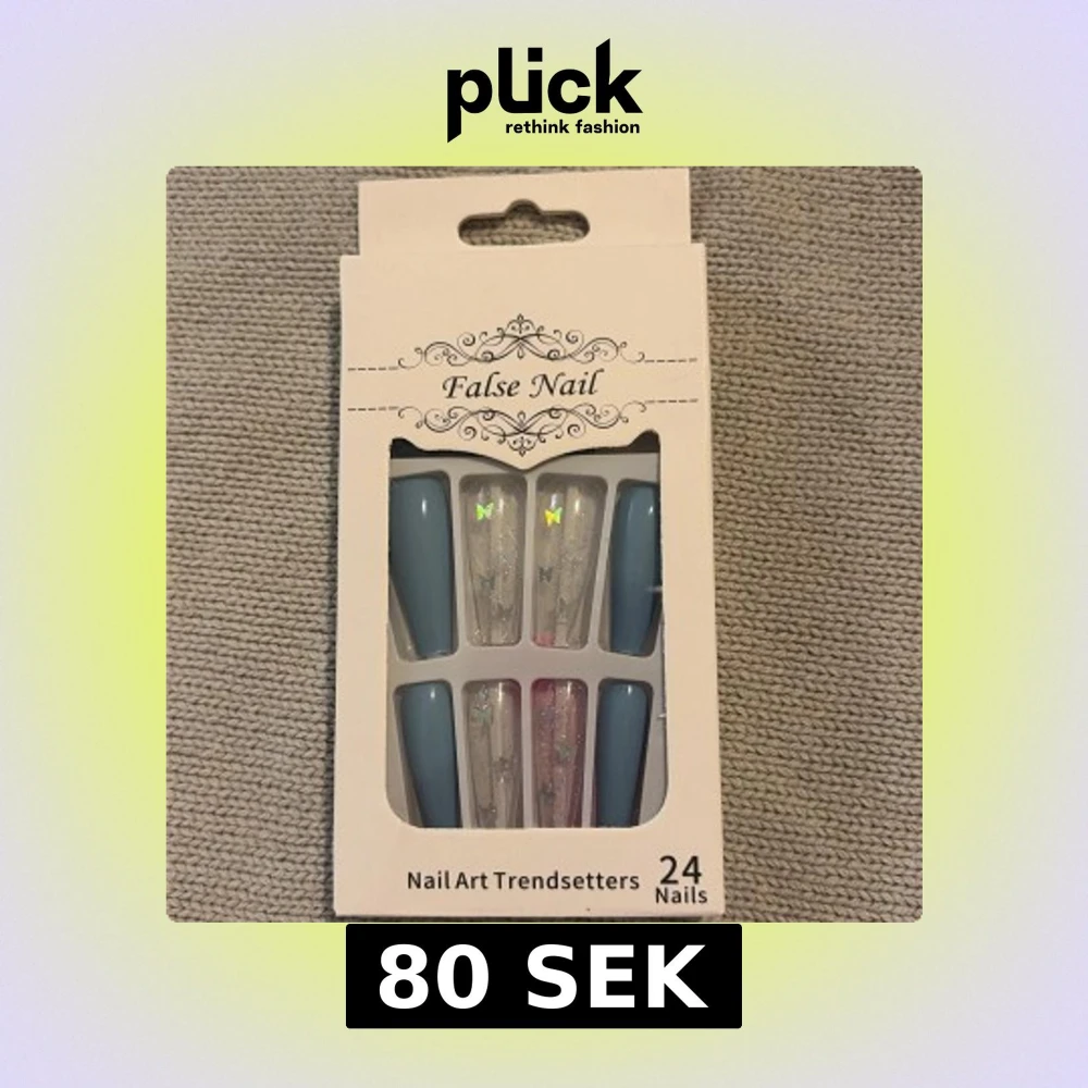 Snygga lösnaglar i set om 24 st. Hälften är matta blå och hälften är transparenta med glitter och små holografiska fjärilar. Naglarna är långa och smala, perfekta för att skapa en trendig look. Materialet är ABS-plast och de fästs enkelt med medföljande lim.