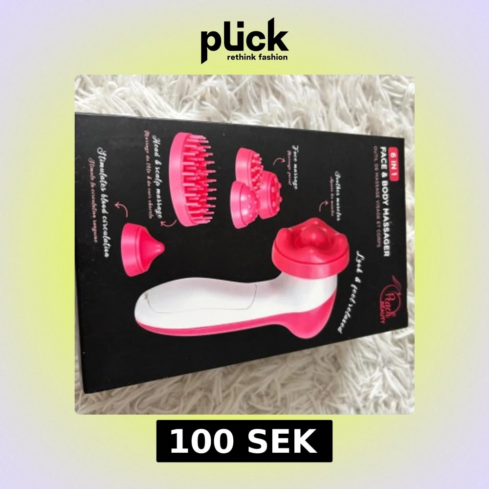 Multifunktionell ansikts- och kroppsmassager med sex olika massagehuvuden i rosa och vitt. Perfekt för att stimulera blodcirkulation och ge en skön massage till ansikte, hårbotten och kropp. Ergonomisk design och flera utbytbara delar för olika behov.