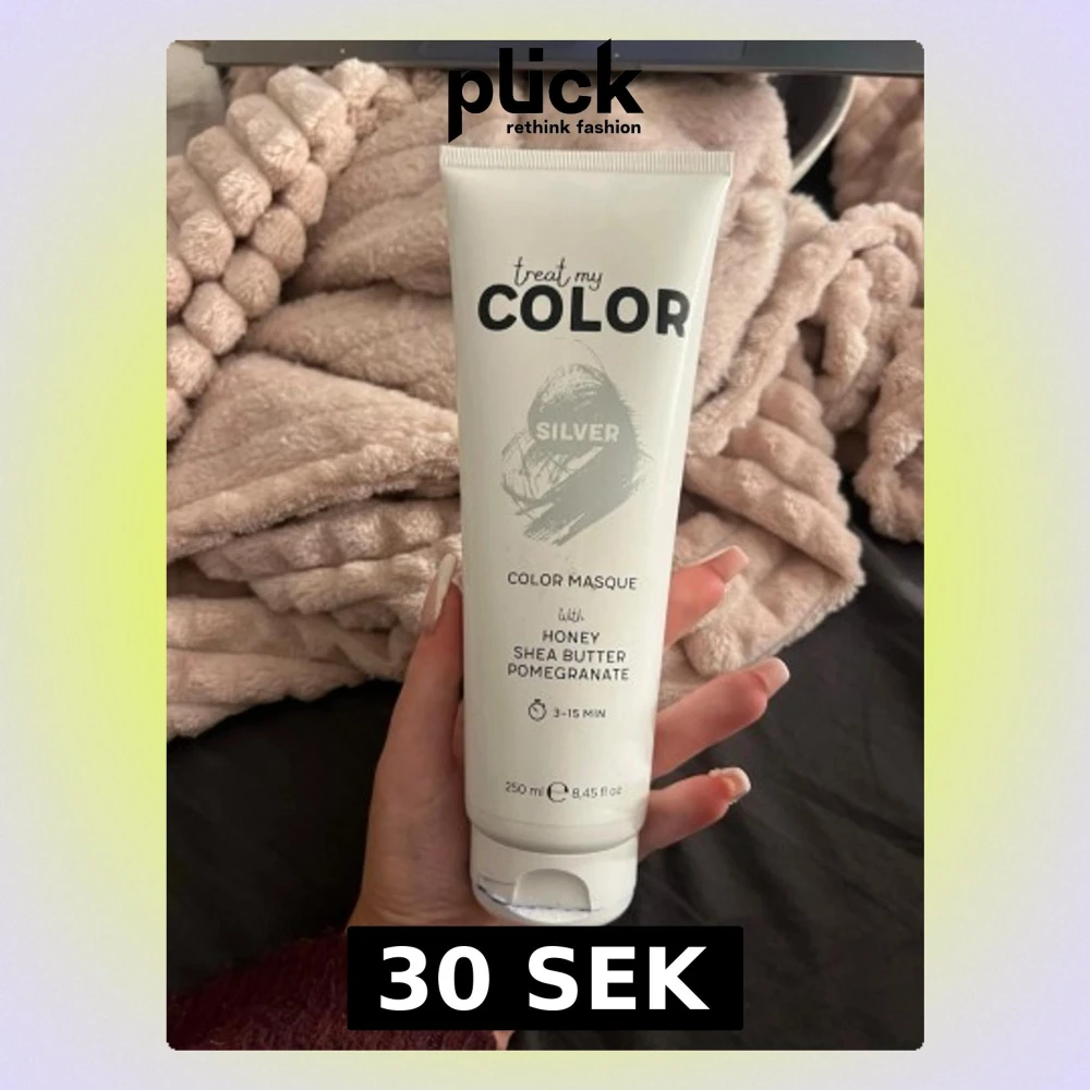 Silverfärgad hårinpackning från Treat My Color med honung, sheasmör och granatäpple. Ger sval ton till blont eller grått hår och vårdar samtidigt. Kommer i en vit tub på 250 ml. Mindre än halva kvar men den är super bra bästa inpackningen som ger toning jag haft. Men är brunett nu🤣