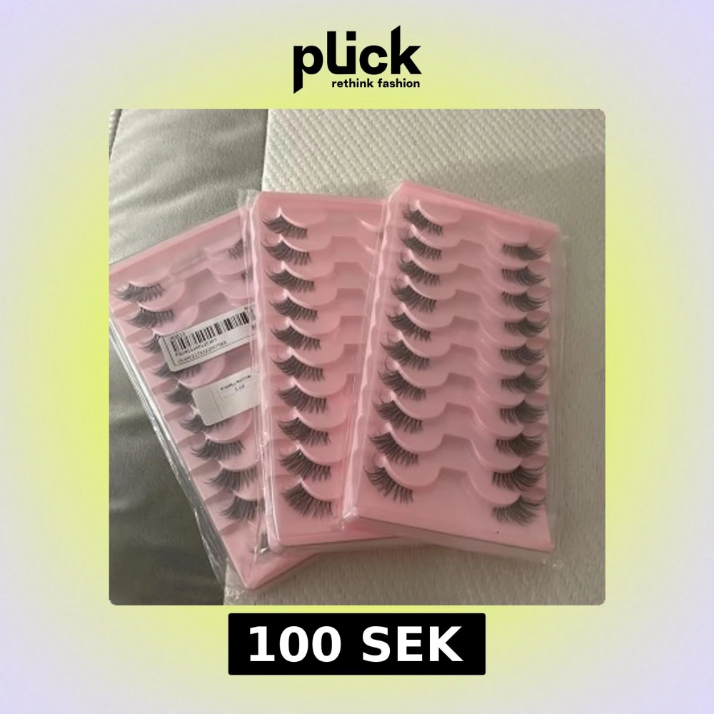 Säljer tre förpackningar med svarta falska ögonfransar, varje ask har rosa plast och innehåller flera par med täta och böjda fransar. Fransarna är långa och ger en dramatisk look, perfekta för att lyfta din sminkning. Materialet är syntetiskt och mjukt.