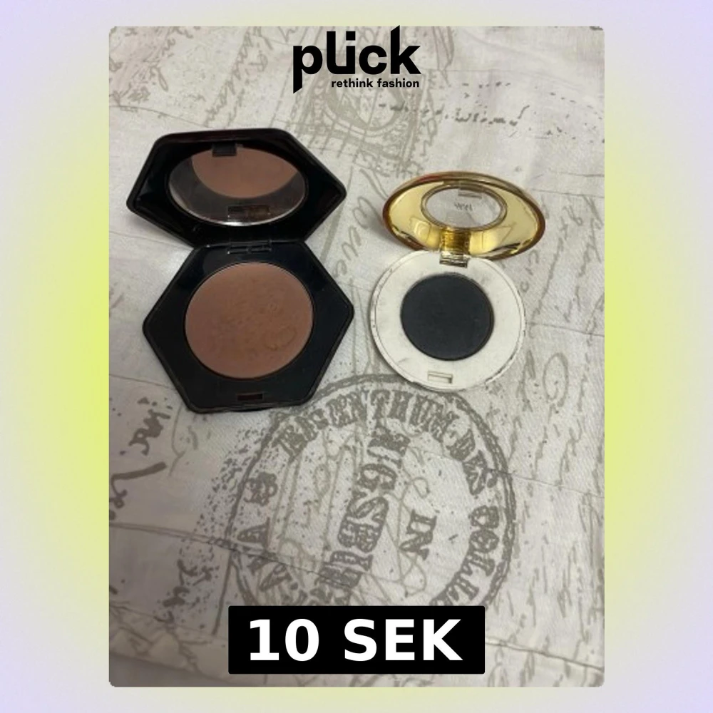 Säljer ett set med en matt brun bronzer i sexkantig svart dosa med spegel och en svart ögonskugga i rund vit dosa med guldfärgat lock. Perfekt för att skapa både markerade och sotade looks. Båda produkterna är i puderform.