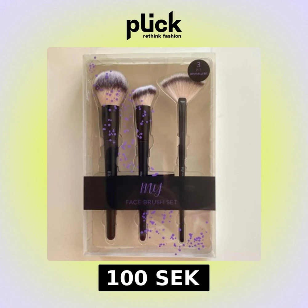 Snyggt set med tre sminkborstar: en puderborste, en spiral foundationborste och en solfjäderborste. Borstarna har svarta handtag och täta, mjuka syntetstrån i vitt och brunt. Perfekt för att fixa basen och highlighta kindbenen.