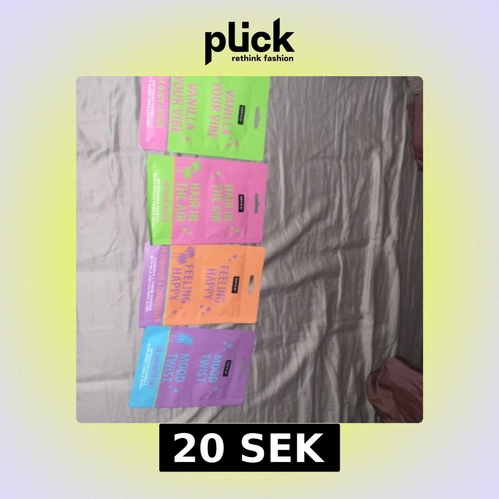 Säljer ett kit med färgglada sminkprodukter från Normal. Innehåller body lotion, hårmask, schampo, balsam och duschgel i dofterna Vanilla Your Vibe, Hair In The Air, Feeling Happy och Mood Twist. Förpackningarna är i rosa, grön, orange och lila plast med tryck.