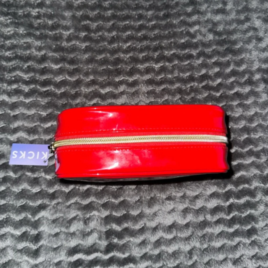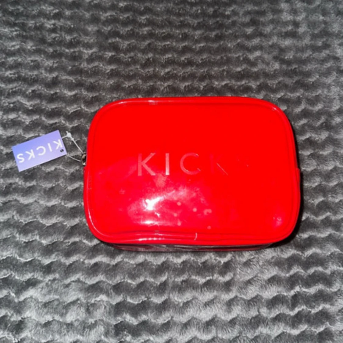 Snygg röd necessär från Kicks i blankt syntetmaterial. Väskan har en praktisk dragkedja och en stilren, rektangulär form. Perfekt för att organisera smink eller småprylar i väskan. Kicks-loggan syns tydligt på framsidan.
