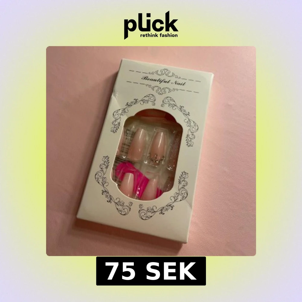 Snygga lösnaglar i nude med silvriga stenar och glitterdetaljer. Innehåller flera naglar i olika storlekar, en rosa nagelfil och limkuddar. Naglarna har en elegant, avlång form och vissa har fransk tipp. Perfekt för att fixa naglarna snabbt hemma.