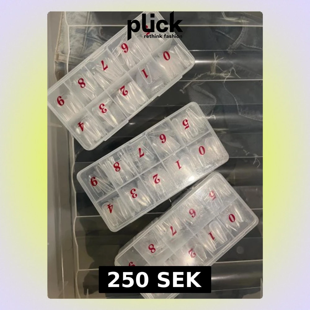 Säljer flera askar med transparenta nageltippar i olika storlekar, perfekt för att skapa egna gel- eller akrylnaglar. Tipparna är gjorda av plast och kommer i organiserade fack med röda siffror för enkel användning. Passar både till salong och hemmafix. Cirka 1300 st